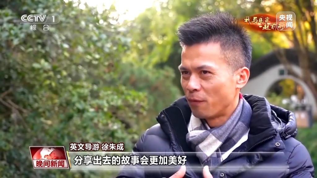 英文导游 徐朱成:国家在为我们搭建⼀个平台,⼈⼈都可以⼤放异彩。以前学英⽂,是为了看世界。现在学英⽂,是为了让全世界的⼈更好地了解杭州,了解中国。